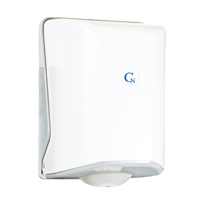 Nástěnný zásobník na papírové ručníky v roli o rozměru : pr. 20x20cm odvíjené středem přes průvlak.