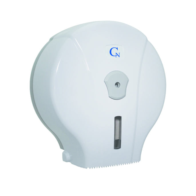 Nástěnný zásobník na role toaletního papíru o průměru max. 28 cm a šířce 10 cm. Vyroben je z bílého ABS plastu se světle šedou základnou. Lze montovat na vruty i samolepky