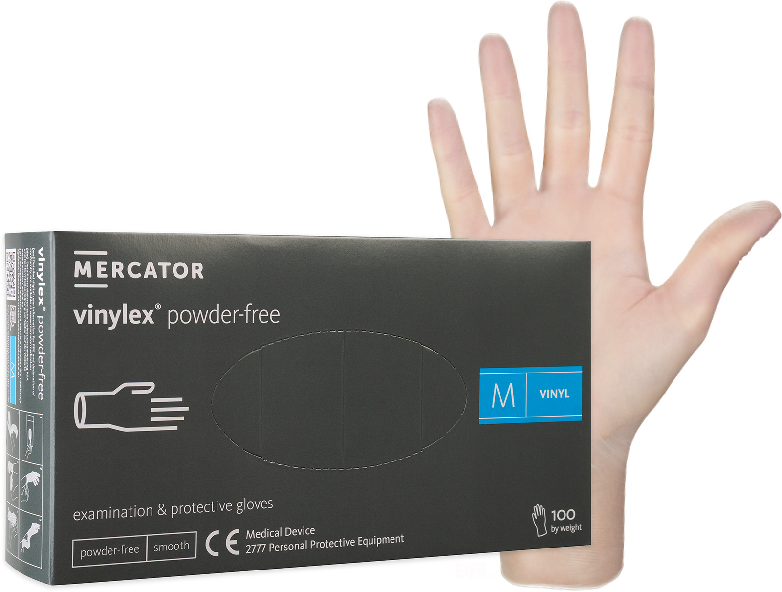 Kvalitní vinylové ochranné rukavice bez latexu určené nejen pro profesionály, vhodné pro osoby alergické na latex nebo s citlivou kůží, bez pudrového prostředku pro usnadnění navlékání i na vlhké ruce. Texturovaný povrch zajišťuje pevný úchop a mimořádnou dotykovou citlivost. Balení 100 ks, velikost M.